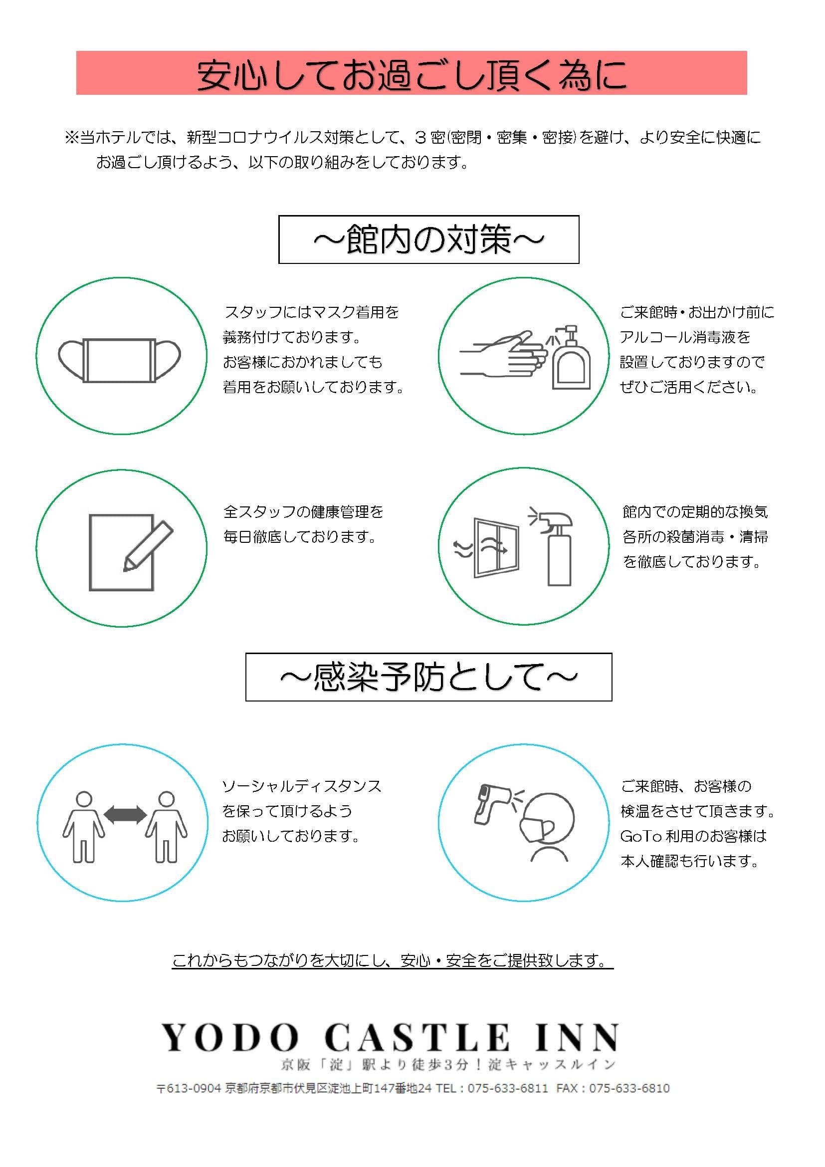 当ホテルでは、新型コロナウイルス対策として、3密(密閉・密集・密接)を避け、より安全に快適にお過ごし頂けるよう、以下の取り組みをしております。